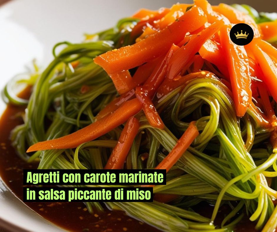 Mondate e lavate gli agretti, scottateli per cinque minuti in acqua bollente salata e disponeteli in una bacinella di vetro. Lavate le carote, grattugiatele o tagliatele a julienne, scottatele per due minuti in acqua bollente salata (potete utilizzare quella degli agretti) e unitele agli agretti. Versate sopra la salsa, mescolate, e lasciate marinare per circa mezz’ora. Ottimo serviti con una guarnizione di semi di sesamo tostati.