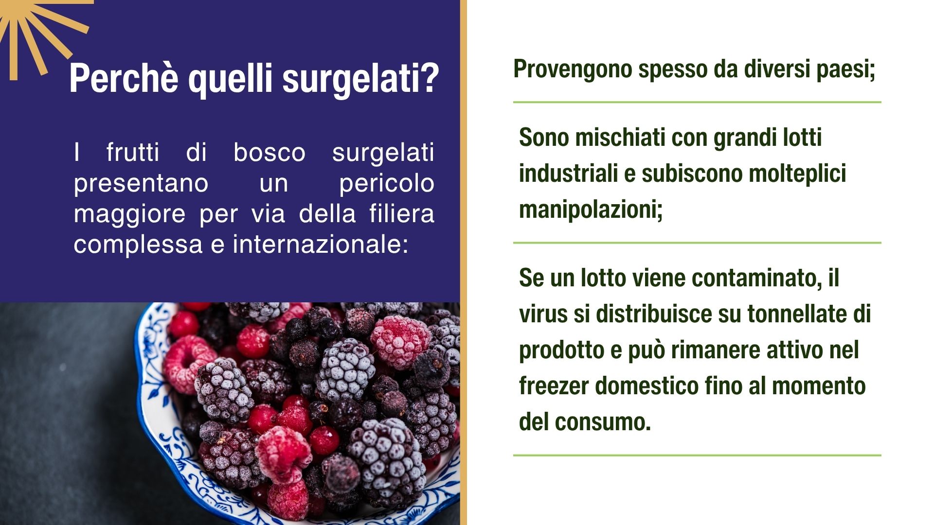 - Se un lotto viene contaminato, il virus si distribuisce su tonnellate di prodotto e può rimanere attivo nel freezer domestico fino al momento del consumo.