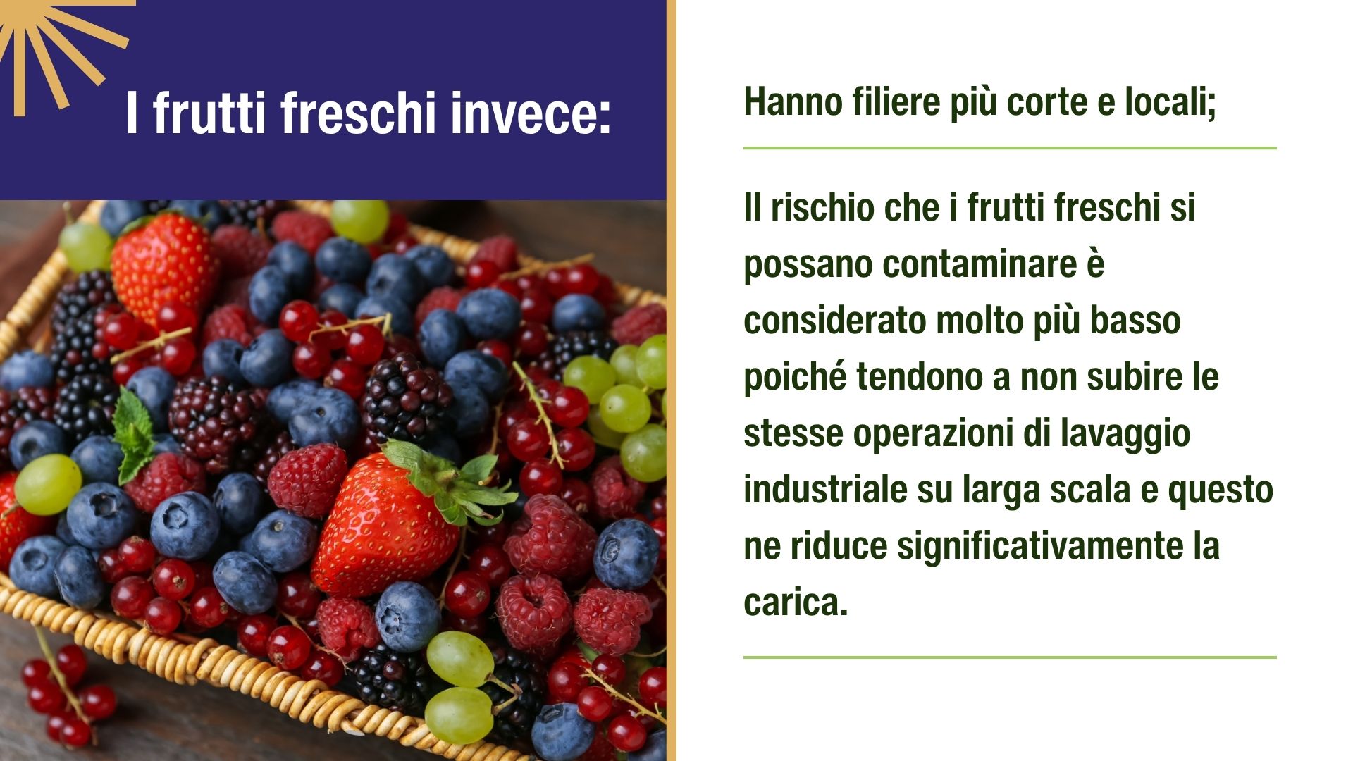 - Il rischio che i frutti freschi si possano contaminare è considerato molto più basso perché tendono a non subire le stesse operazioni di lavaggio industriale su larga scala e questo ne riduce significativamente la carica.