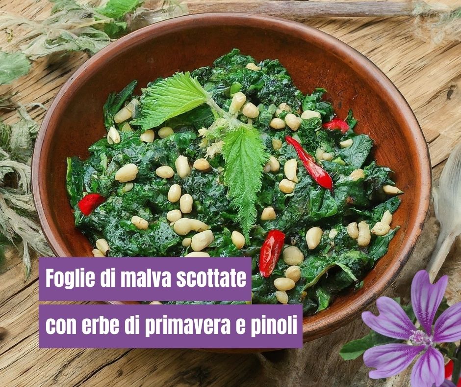 Foglie di malva scottate con erbe di primavera e pinoli
