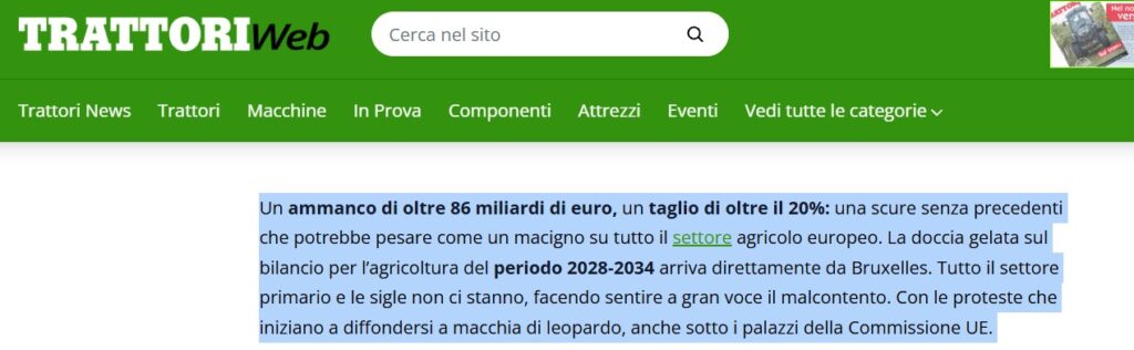 “Un ammanco di oltre 86 miliardi di euro, un taglio di oltre il 20%: una scure senza precedenti che potrebbe pesare come un macigno su tutto il settore agricolo europeo. La doccia gelata sul bilancio per l’agricoltura del periodo 2028-2034 arriva direttamente da Bruxelles”.