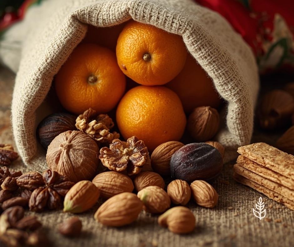 In passato, nella calza, si mettevano beni alimentari semplici come mandarini, frutta secca (noci, spagnolette, fichi secchi, mandorle) a simboleggiare doni di responsabilità e gratitudine.